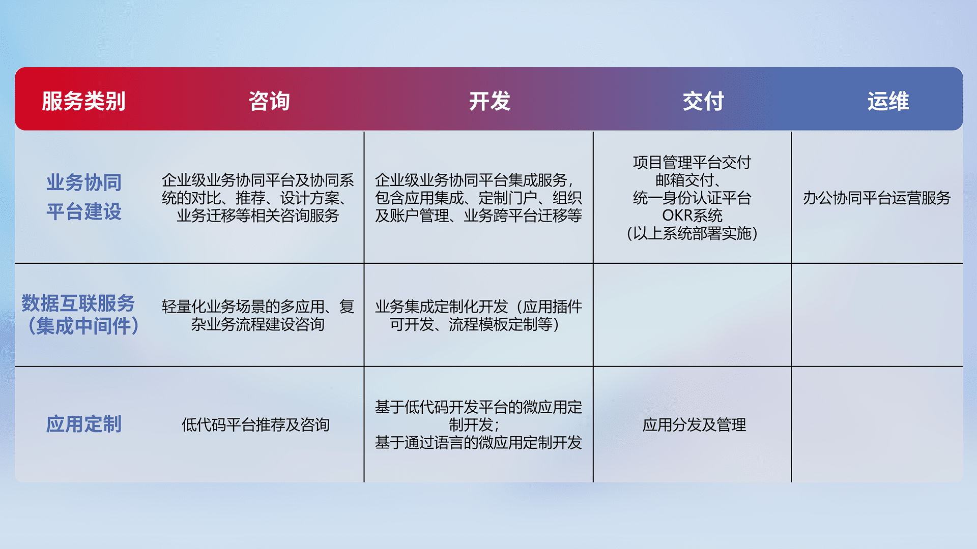 针对钉钉、、企微、、、IDaas等平台级产品提供产品的规划、、、方案、、、、交付、、定制化开发等服务,,实现如统一协同办公、、、智能客户服务、、、混合会议管理、、智能数据查询、、、等业务场景,,,,实现数字化转型。。