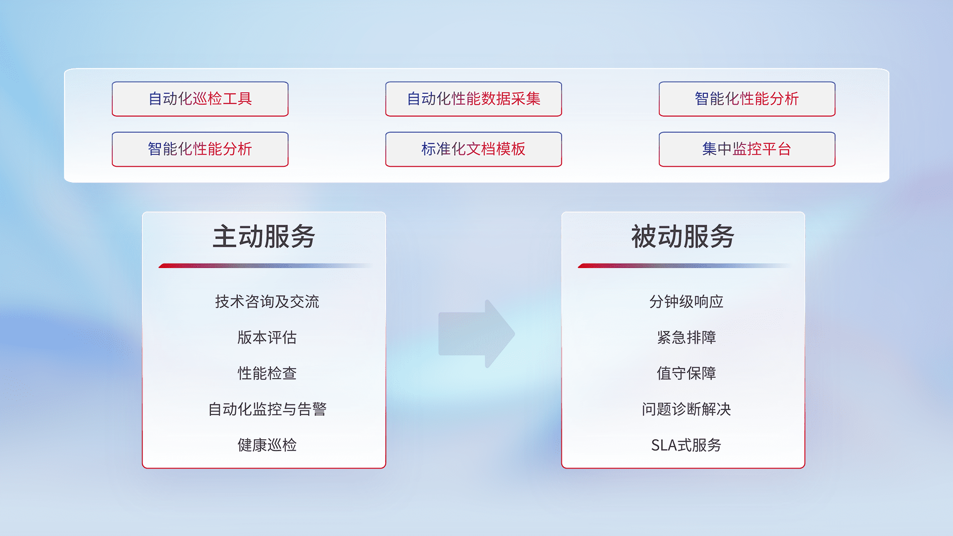 智能化工具和标准化文档,,,保障服务质量,,提供主动服务(包含技术咨询、、、、版本评估、、、性能检查、、、、自动化监控与告警、、、健康巡检)和被动服务包含(分钟级响应、、紧急排障、、值守保障、、、、问题诊断解决、、、、SLA服务)。。